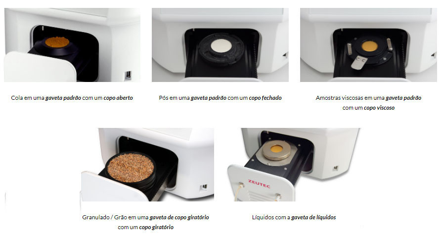 Versatilidade Total: Graças ao sistema de gavetas intercambiáveis e diversos copos de amostra, você analisa desde óleos e líquidos até farinhas e grãos inteiros.