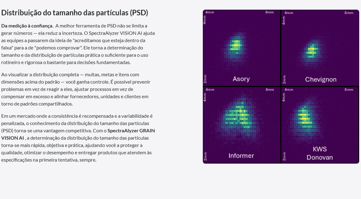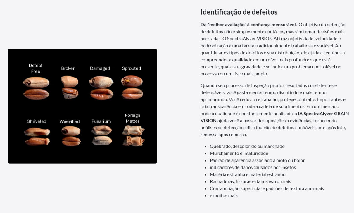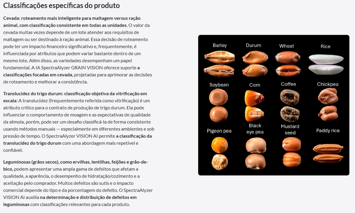 O SpectraAlyzer GRAIN VISION concentra-se naquilo que o olho — e a classificação tradicional — sempre tentou capturar, mas o faz numa escala superior e com maior consistência:
