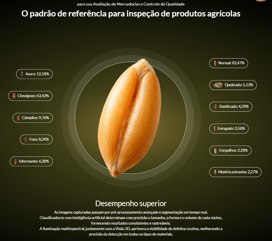 Visão 3D e Multiespectral: Equipado com câmeras duplas de alta resolução que documentam 360° da superfície de cada grão, permitindo detectar defeitos ocultos.